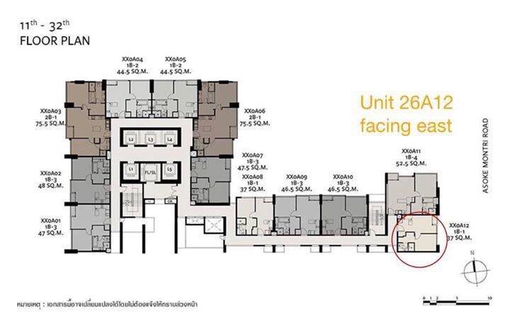 ขนาดห้อง 37 ตร.ม. ชั้น 26 ทิศตะวันออก ห้องมุม